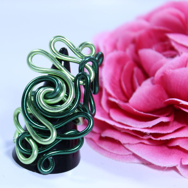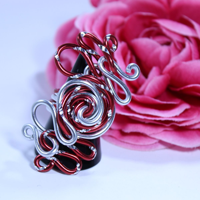 Bague exclusivement réalisée en fil aluminium, englobant le doigt